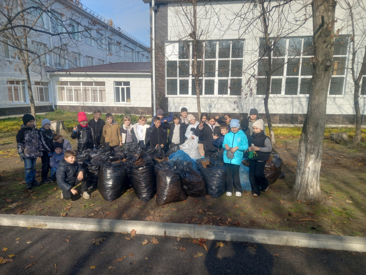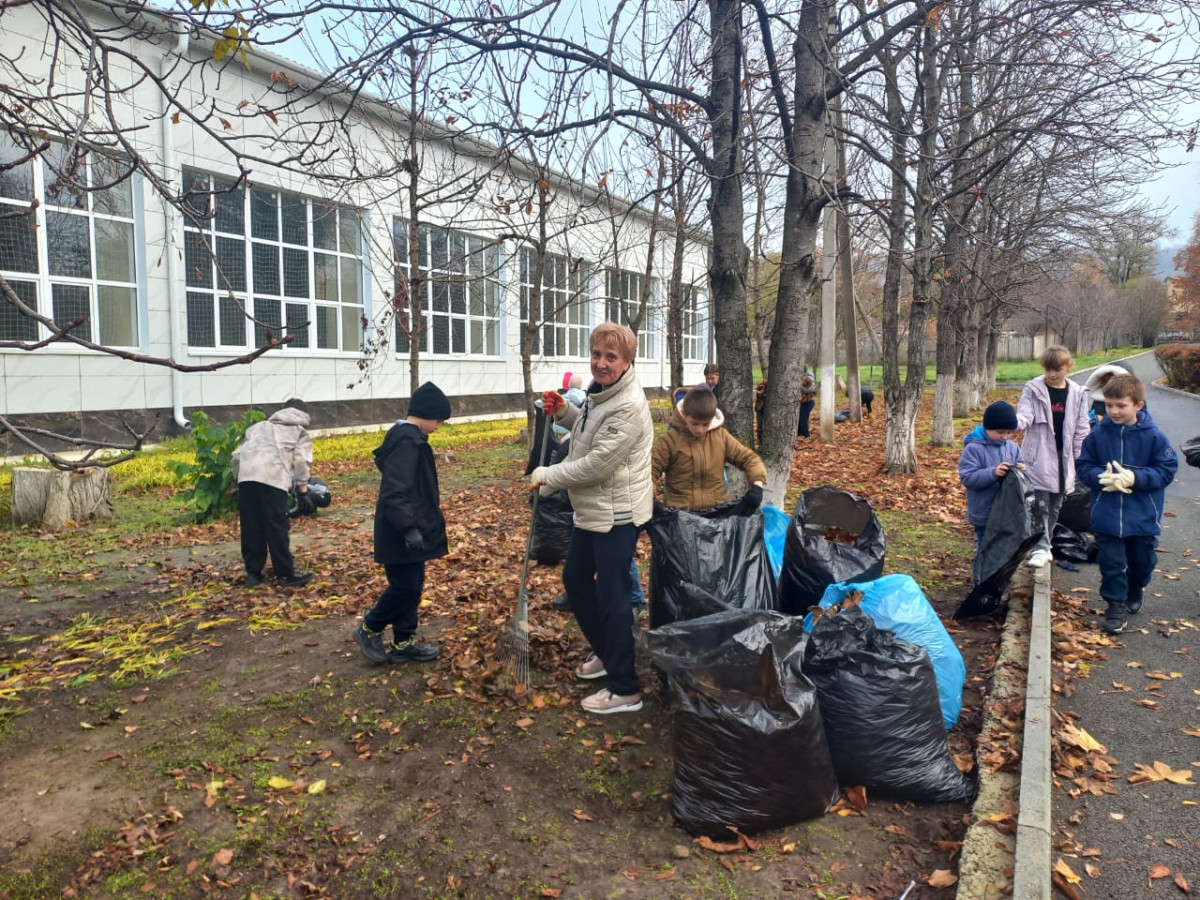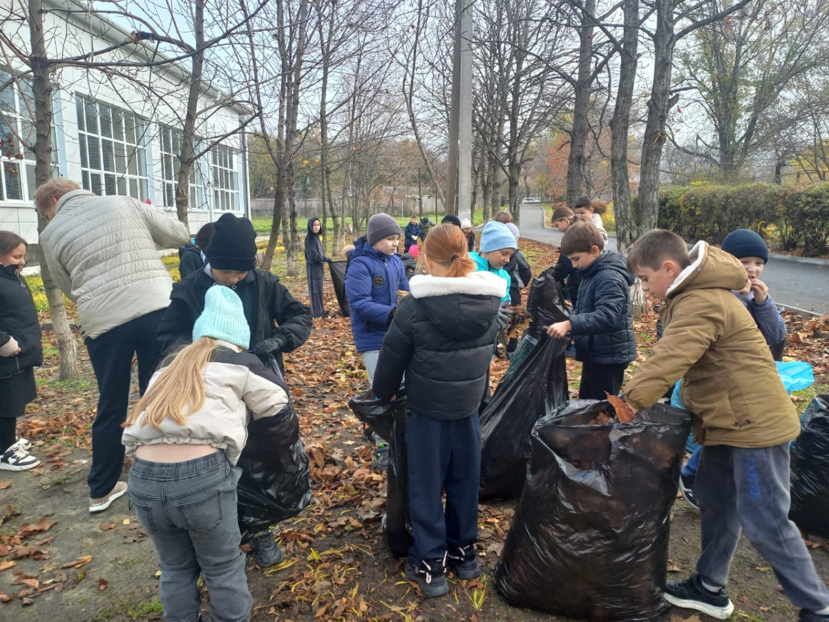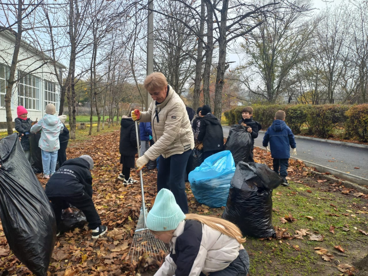 Ребята приняли решение оказать помощь дворнику в очистке школьной территории от осенней листвы.