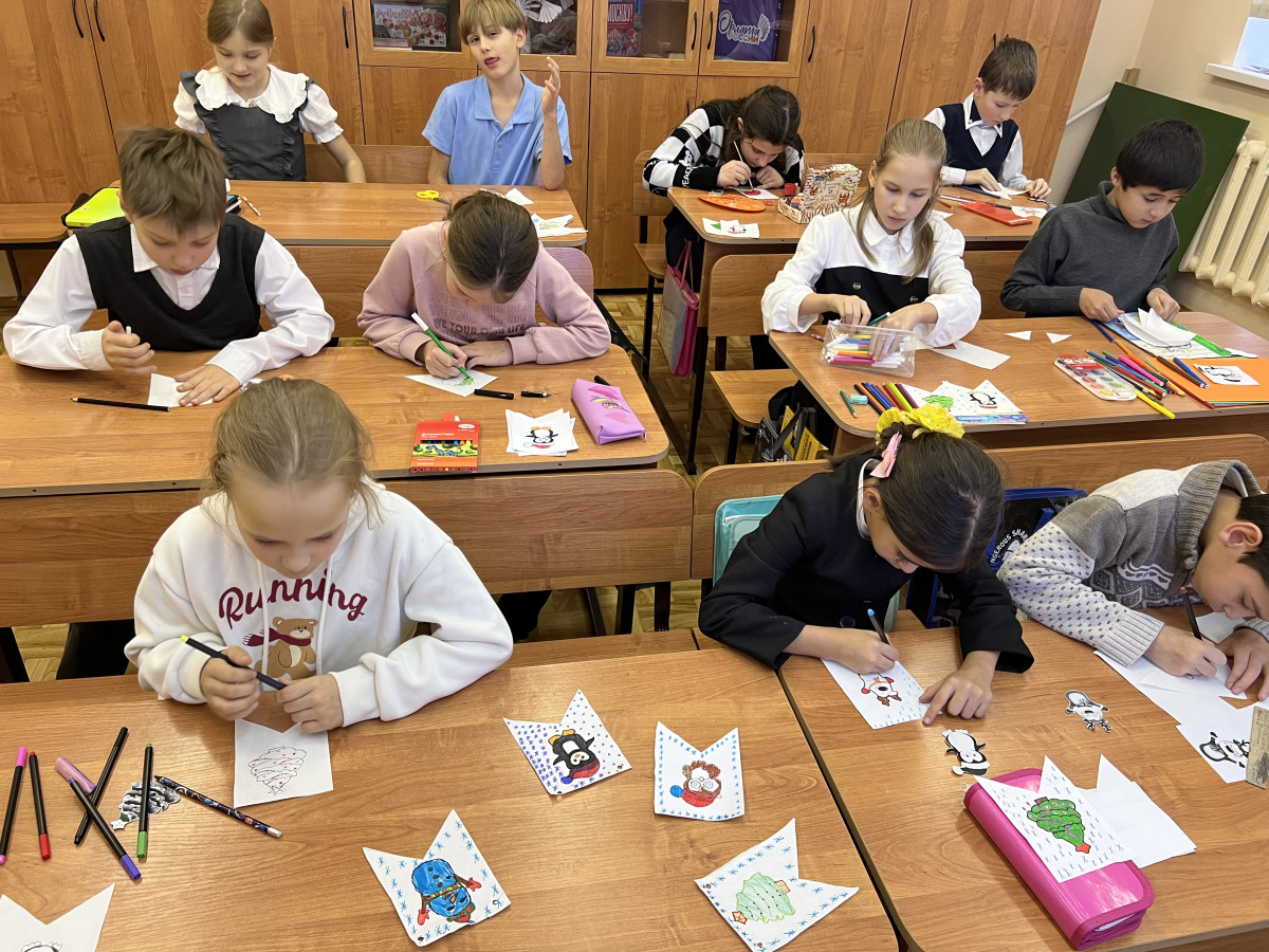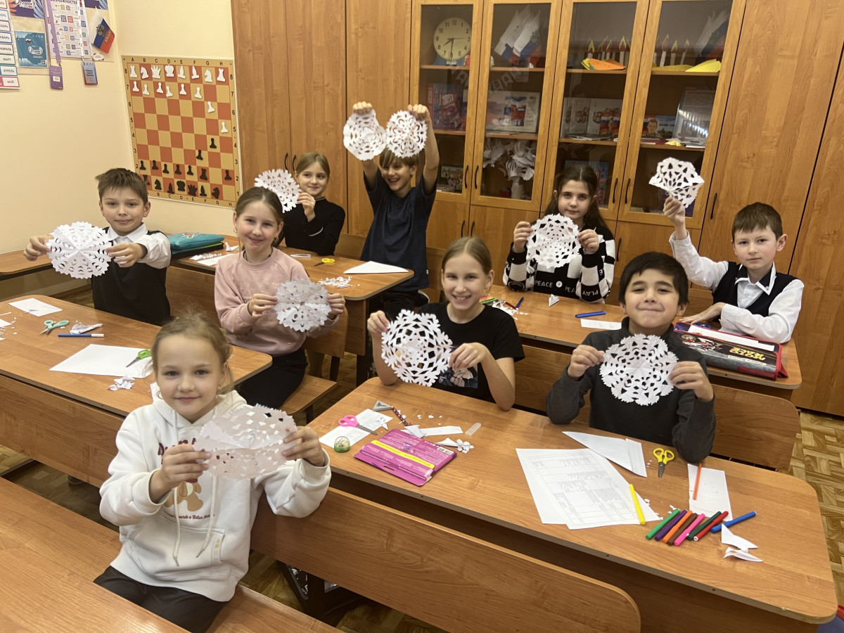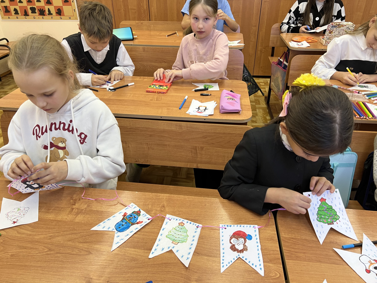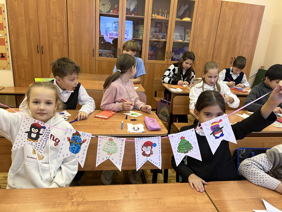 Первоклассникам показали очень хороший добрый фильм "Дед Мороз знает", который поспособствовал тому, чтобы ребята тоже захотели готовиться к празднику. Совместно с другими учениками начальных классов сделали интересную гирлянду из флажков и нарезали снежинок. Осталось украсить класс и фойе школы. Все вместе создаем новогоднее настроение!