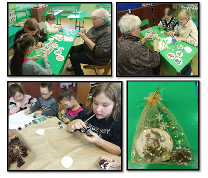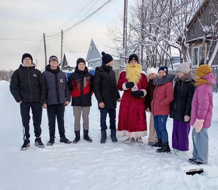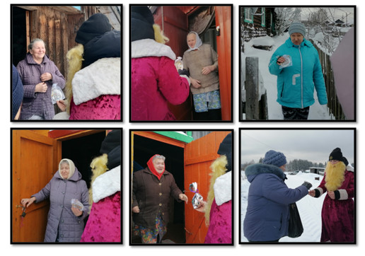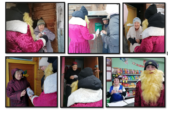 Наше занятие началось с беседы “Новый год у ворот!» Все мы знаем, что это самый долгожданный и любимый праздник у многих! А еще говорят, что самый лучший праздник – это его ОЖИДАНИЕ и ПОДГОТОВКА к нему. Потому что люди начинают что-то придумывать, сочинять, творить…А это значит, что жизнь людей становится интереснее и радостнее. А иногда, творчество даже помогает преодолеть какие-то жизненные трудности, решить какую-то проблему, как это мы увидели в фильме «Дед Мороз знает». У героев фильма это получилось, а сможем ли мы, проявив свое творчество, сделать в жизни что-то хорошее для других? Ребята предложили поздравить ветеранов деревни, тех, у кого дети и внуки живут далеко. Потом решили, что уж если дарить радость, то и тем, чьи мужья и сыновья защищают Родину и не могуг в этот праздник быть рядом с семьей. С родителями обсудили свою идею и они помогли финансово. Работа закипела. Учащиеся начальных классов со своими классными руководителями под чутким руководством учителя труда красили шишки, декупажили, оформляли подарки. И вот к Новому году наши сюрпризы готовы! Накануне праздника Дед Мороз со старшеклассниками, весело шагая по деревенским улочкам, поздравлял всех с наступающим праздником и вручал подарки ветеранам. К этим новогодним поздравлениям присоединились и специалисты Вятского Дома культуры, вместе с нашим Дедом Морозом они прошагали всю деревню, вручая свои подарки ветеранам.