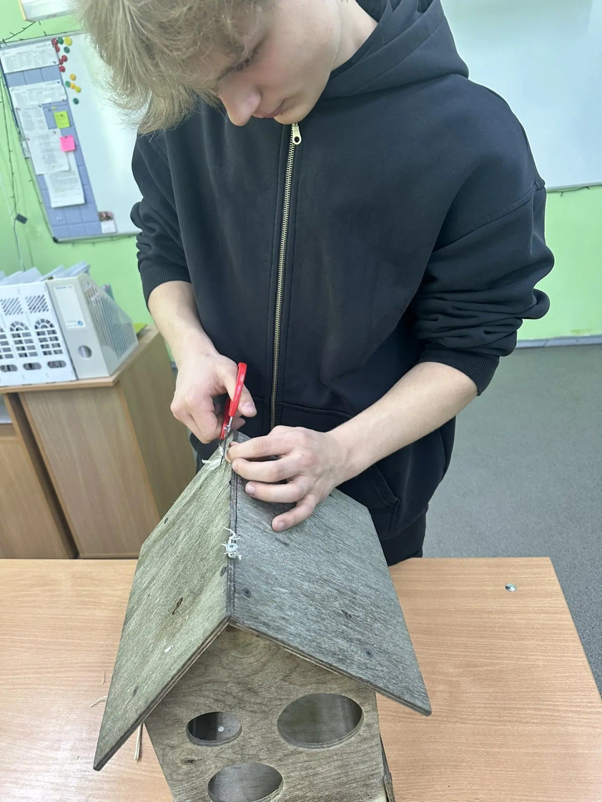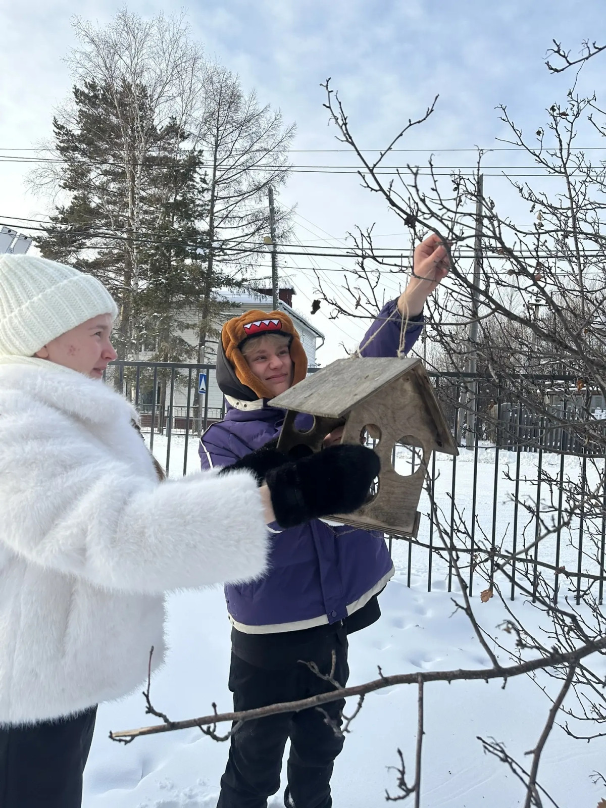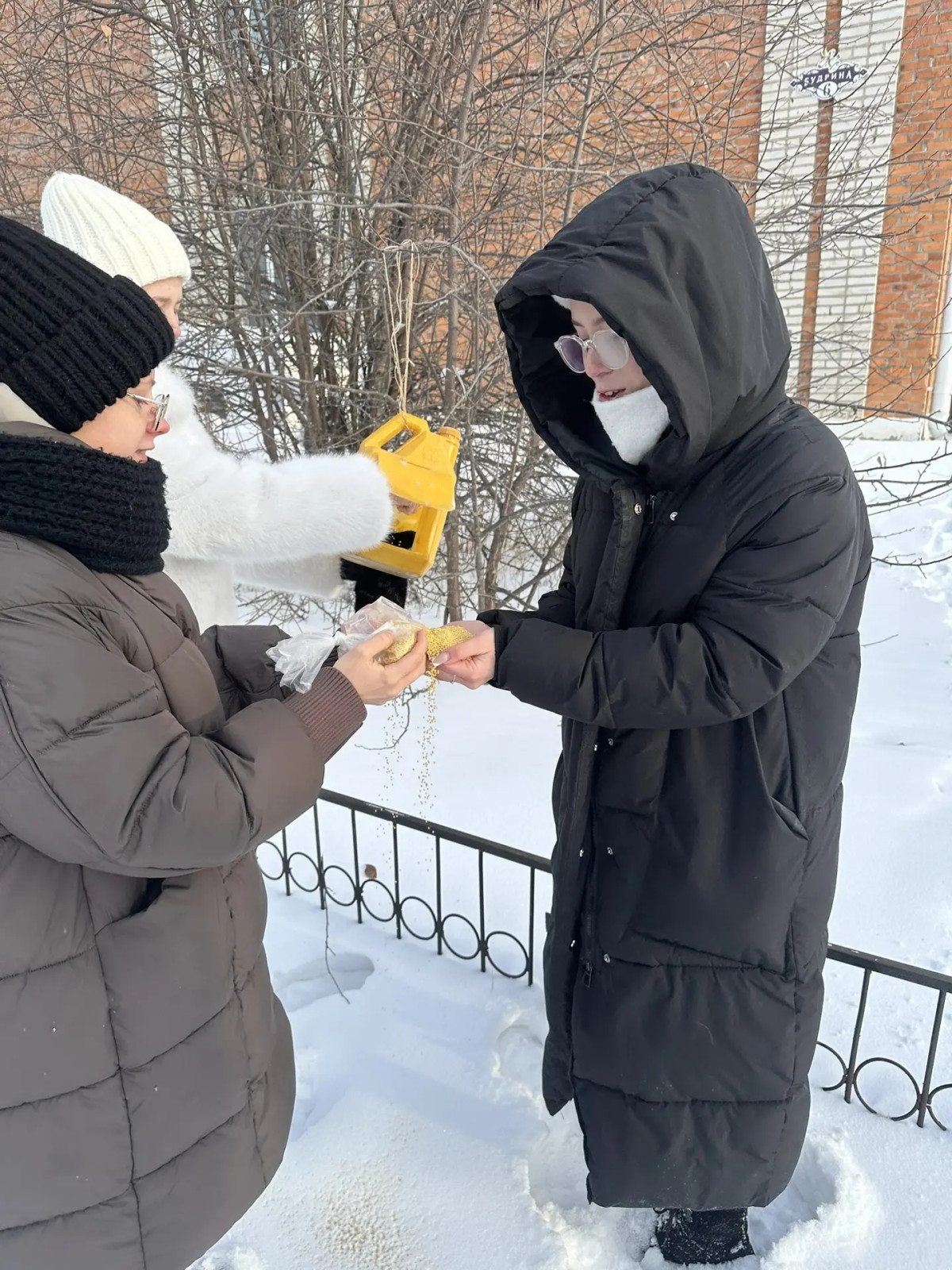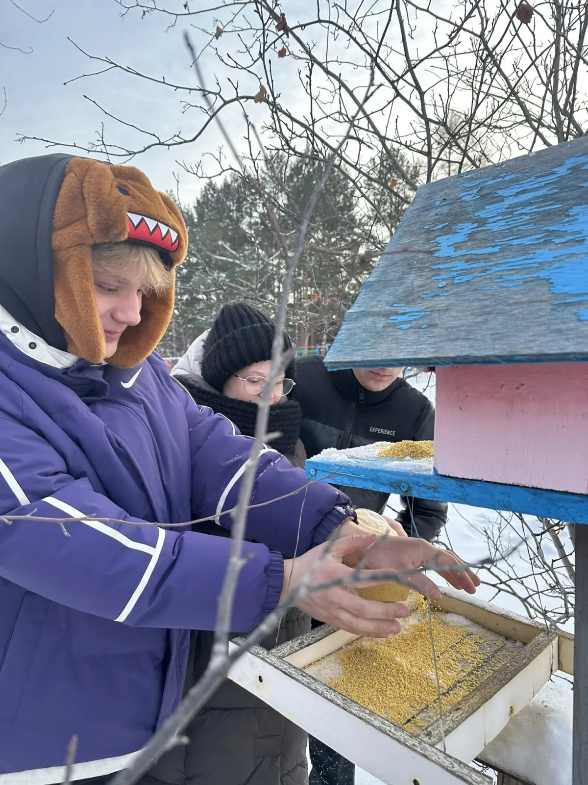 Старшеклассники решили навести порядок со школьными кормушками на территории школы. Отремонтировать некоторые из них, пополнить запасы птичьей провизии. Юноши занялись ремонтом, а девушки распределяли купленное зерно.