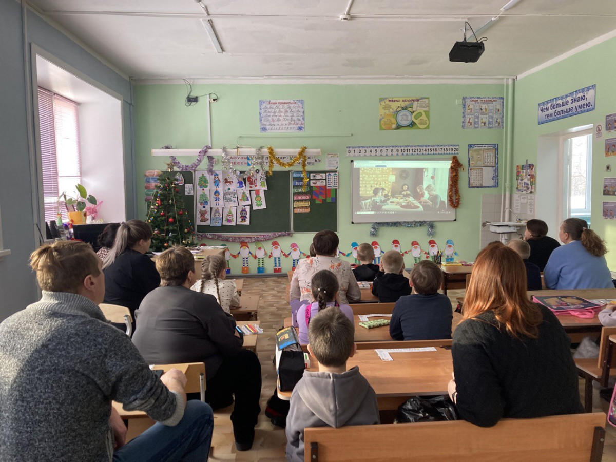 В рамках всероссийского проекта «Киноуроки в школах России» ученики первого класса совместно с родителями посмотрели короткометражный фильм режиссёра Елены Дубровской «Дед Мороз знает».