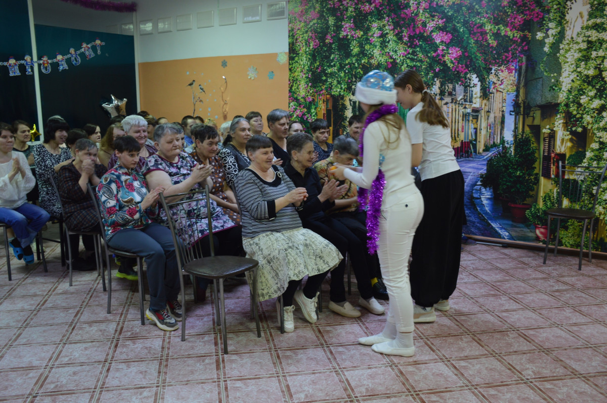 В качестве ведущих пригласили учеников параллельного 7 в класса, которые являются активистами школьного волонтёрского отряда «Адрес: милосердие». После концерта ребята раздали всем мандарины, приобретённые всем классом в качестве небольших подарков. Зал сразу наполнился ароматом праздника. раздали всем мандарины, наполнив зал ароматом праздника. Это был особенный день как для пациентов ПНД, так и для самих школьников — они увидели благодарные улыбки и услышали аплодисменты зрителей. Их встречали очень душевно и радостно. Ребята поняли, как же это здорово — творить добро!