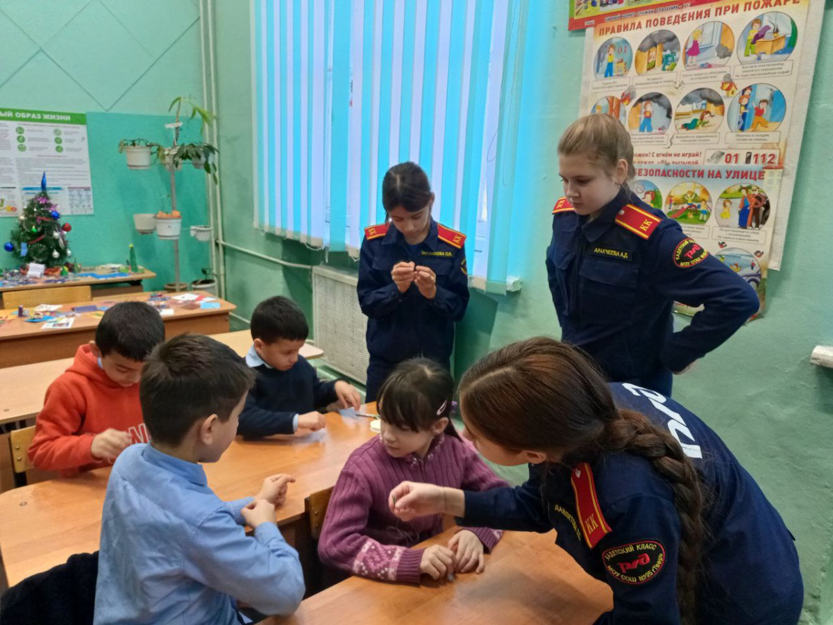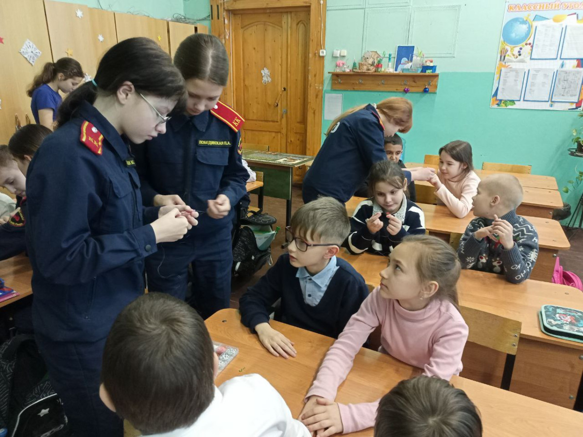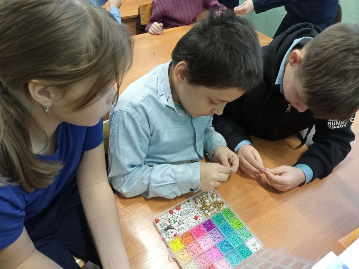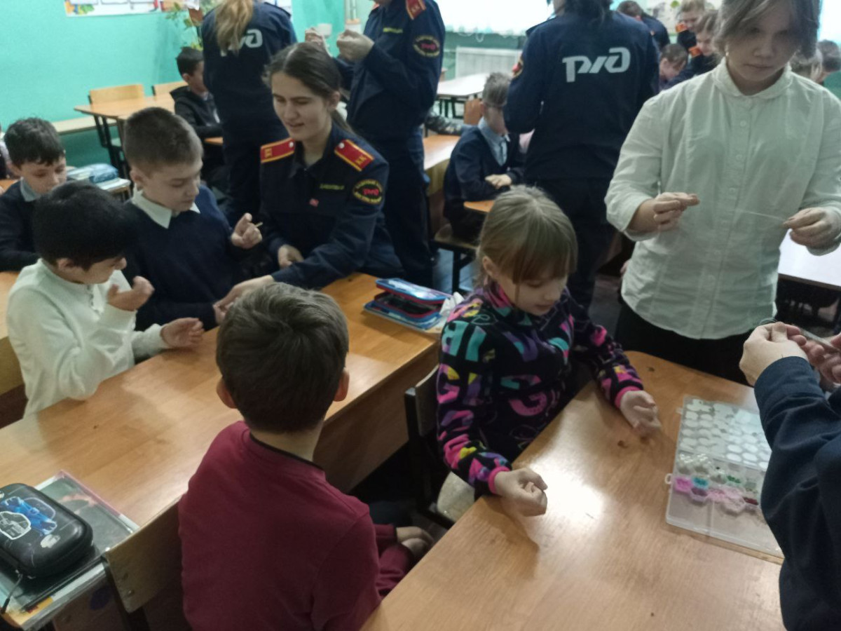 Поэтому в преддверии Нового года кадеты показывали обучающимся 2 классу технику плетения из бисера, чтобы они смогли сделать небольшие новогодние подарки из бисера.