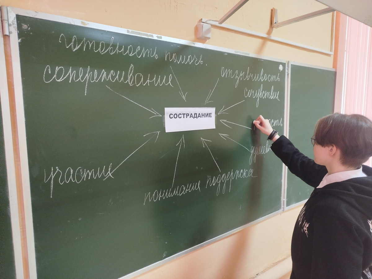 Перед просмотром фильма «Мамины сказки» обучающиеся с особенностями 9Г класса с классным руководителем Минаковой Д.Ю. ответили на вопрос «что такое сострадание». Составили кластер, характеризующий центральное понятие «сострадание», определили, что в него входит. Сделали вывод о том, что это особое качество души человека, способность понимать и сопереживать чувствам и переживаниям другого человека, способность чувствовать чужую боль, как свою собственную.